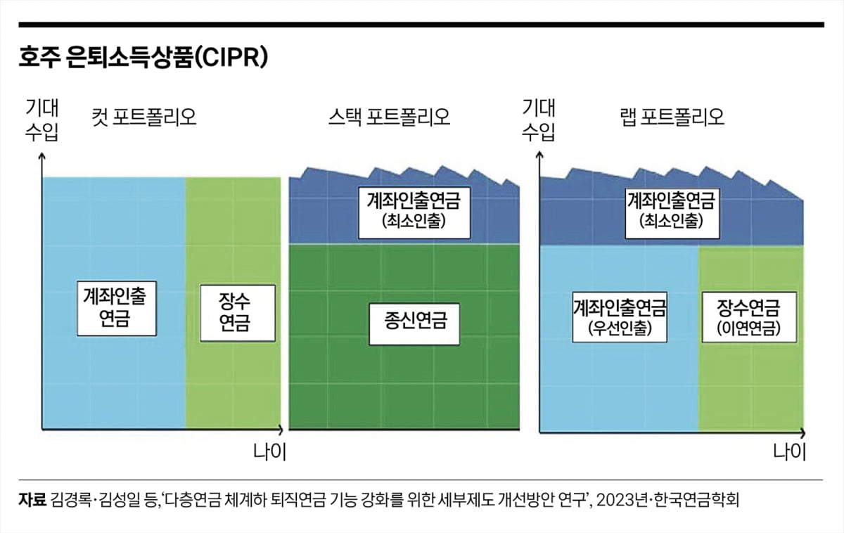 연금 선진국으로 평가 받고 있는 호주는 은퇴자들에게 ‘안정 소득’, ‘장수 위험’ ‘유연 인출’ 등의 요소를 갖춘 은퇴소득상품(CIPR)을 제공하고 있다. 대표적인 은퇴소득상품으로 계좌인출연금과 장수연금이 혼합된 ‘컷(Cut)’ ‘스태크(Stack)’ ‘랩(Wrap)’ 등 세 가지 포트폴리오가 있다. 계좌인출연금은 인플레이션 리스크를 극복할 수 있는 데 비해 장수 리스크에 약하다. 장수연금은 장수 리스크를 극복할 수 있는 대신 인플레이션 리스크에 약하다.