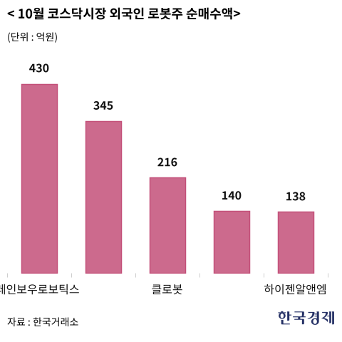 16일 한국거래소에 따르면 외국인 투자자들은 이달 들어(10월1일~15일) 코스닥시장에서 레인보우로보틱스를 430억원어치 순매수(3위)했다. 이어 휴림로봇(5위·345억원), 클로봇(8위·216억원), 유일로보틱스(9위·140억원), 하이젠알앤엠(10위·138억원) 등을 대거 사들였다. 코스닥시장 순매수 상위 10개 종목 가운데 절반이 로봇주로 나타났다. 이들의 매수세에 힘입어 같은 기간 하이젠알앤엠(58.80%)과 클로봇(50.52%), 휴림로봇(32.19%), 유일로보틱스(24.12%), 레인보우로보틱스(12.78%) 등이 강세를 보였다.