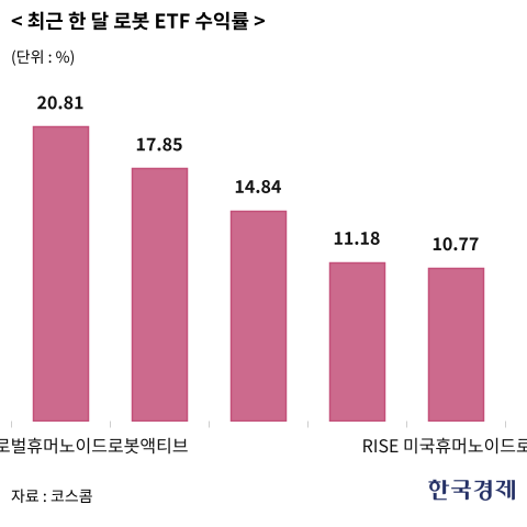 국내 로봇주는 앞서 지난 8월 노란봉투법이 국회를 통과한 이후 강세를 보이기 시작했다. 산업 현장에서 자동화가 활발하게 이뤄질 것이란 이유에서다. 대외적으로 미중 관세분쟁이 로봇 분야로 옮겨질 수 있다는 우려도 최근 로봇주로 관심을 끌어들이는 요인이다. 최근 한 달(9월15일~10월15일) 사이 'PLUS 글로벌휴머노이드로봇액티브'(20.81%)를 비롯해 'KODEX 로봇액티브'(17.85%), 'KoAct 글로벌AI&로봇액티브'(14.84%), 'RISE AI&로봇'(11.18%), 'RISE 미국휴머노이드로봇'(10.77%) 등이 높은 수익률을 기록했다.
