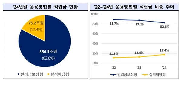 퇴직급여는 임금후불 성격을 갖고 있어 원금보장에 대한 인식이 큰 편이다. 예를 들어 본인 여유자금으로 가입하는 연금저축의 경우 작년 신규계약 중 실적배당형(펀드) 비중이 88.7%에 달했다. 반면 퇴직연금은 실적 배당형 비중(17.4%)이 원리금 보장형(82.6%)보다 훨씬 낮다.