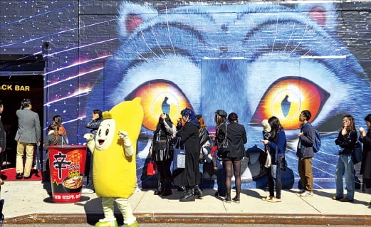 이날부터 3일간 열리는 꿈 페스티벌에는 총 1만 명이 찾을 것으로 예상된다. 현장은 말 그대로 ‘한국 문화 축제’였다. 영화 ‘케이팝 데몬 헌터스’ 벽화로 꾸며진 농심의 라면·과자 체험관 앞에는 캐릭터 의상을 따라 입은 외국인들이 긴 줄을 이뤘다. 코스맥스, 컬리 등 한국 소비재를 경험할 수 있는 전시 부스와 전통시장을 연상시키는 한식 가판도 마련됐다. 뉴욕 주민인 노아 스페로는 “대학생 때 K팝을 좋아하게 돼 한국어를 배웠다”며 “한국 문화와 음식을 즐길 수 있는 행사가 잘 갖춰져서 재밌다”고 말했다.