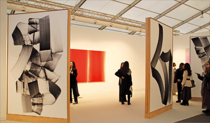 폭스 CEO 말처럼 올해 프리즈 런던에선 한국 갤러리들이 개막 첫날부터 선방했다. 국제갤러리는 하종현 화백의 ‘접합’ ‘이후 접합’ 등 평면 작업을 3억~4억원대에 판매했고 이기봉 김윤신 이희준 박찬경 등의 작업도 첫날 주인을 찾았다. 프리즈 런던에서 이배와 김택상 작품을, 프리즈 마스터스에서 박서보 화백의 주요 작품을 집중적으로 선보인 조현화랑은 수많은 기관과 컬렉터의 관심을 이끌어냈다. 부스를 지나던 현지 컬렉터들은 곳곳에서 “(국제갤러리 부스를 가리키며) 이곳은 한국에서 중요한 갤러리 중 하나”라고 소개했다.