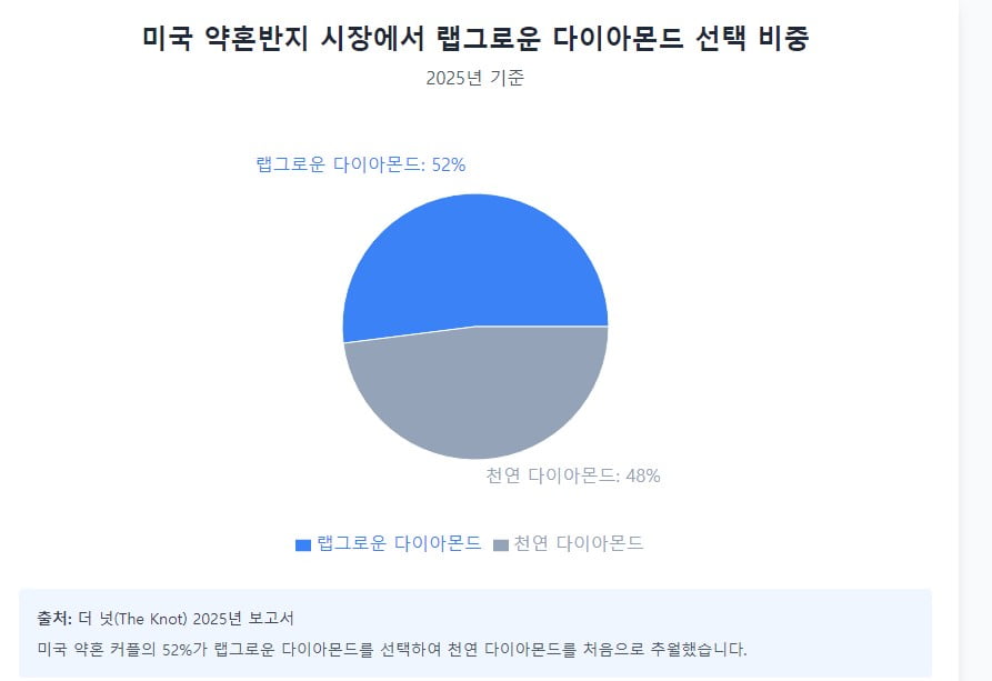 주얼리 보험사 브라이트코의 올해 보고서에 따르면, 작년 기준 미국 약혼반지 구매에서 LGD가 차지하는 비중은 45%를 넘어섰다. 결혼 전문 플랫폼 더 넛의 올해 보고서도 미국 약혼 커플의 52%가 LGD를 선택했다고 발표했다.