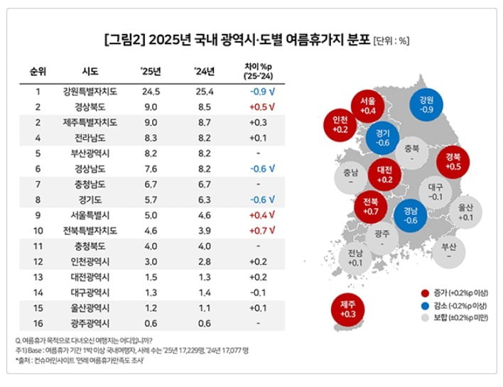 실제 여름 휴가지 점유율에서는 강원(24.5%)이 압도적 1위를 유지했고 경북과 제주가 9.0%로 동률 2위였다[그림2]. 다만 강원은 전년(25.4%) 대비 감소 폭이 0.9%p로 모든 지자체 중 가장 컸다. 경남과 경기(-0.6%p)도 감소했다. 반면 전북(+0.7%p), 경북(+0.5%p), 서울(+0.4%p), 제주(+0.3%p)는 전년 대비 상승이 두드러졌다.
