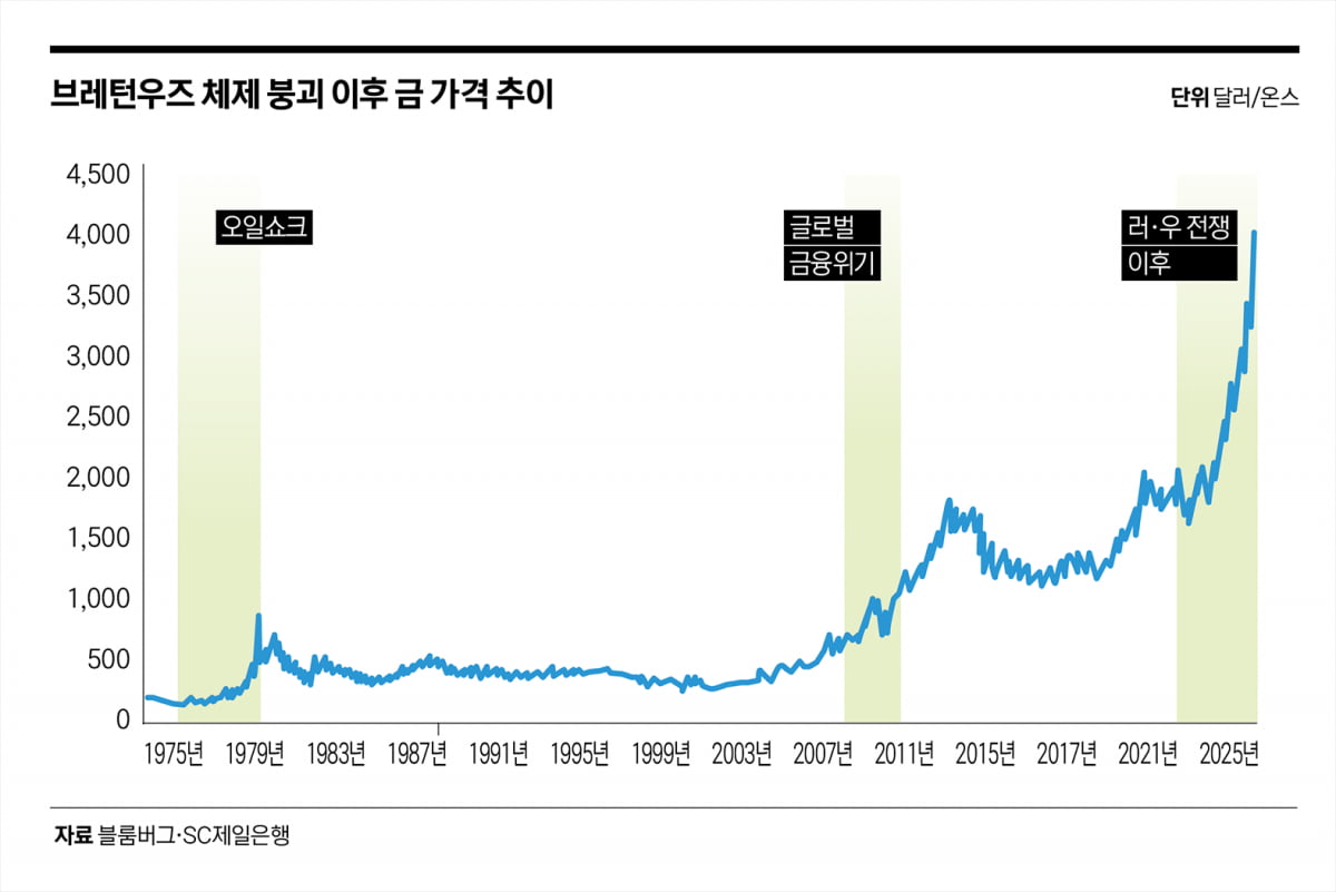 제2차 세계대전 이후 미국이 주도하고 보증한 국제 경제 질서 속에서 달러 패권은 공고해져 왔다. 특히 1971년 브레턴우즈 체제 붕괴 이후, 금은 존 메이너드 케인스가 말한 대로 ‘야만적인 유산(barbarous relic)’으로 평가되며 주요국들은 금을 매각하고 미국 국채 등 달러 자산으로 외환보유액을 전환하는 경향을 보였다. 이때부터 금 가격은 미국 달러 시스템의 긴장과 불안 수준을 반영하는 일종의 스트레스 지표로 기능해 왔다.