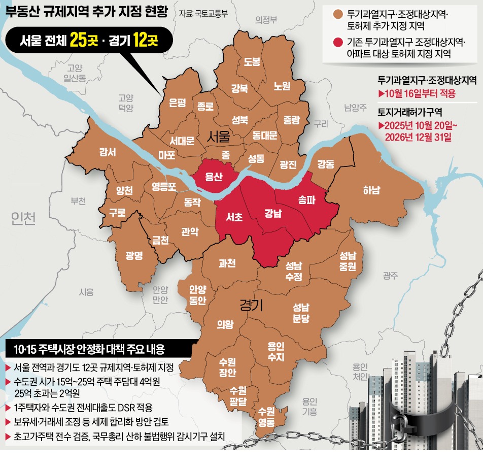 22일 업계에 따르면 10·15 부동산 대책은 대출, 세제, 청약을 아우르는 강력한 수요 억제책이다. 2023년 1월 이후 2년9개월여 만에 조정대상지역과 투기과열지구 등 규제 지역을 전면 부활시켰다. 기존 규제지역인 서울 강남 3구와 용산구를 포함해 서울 나머지 21개 구와 경기 과천, 광명, 성남(분당·수정·중원구), 수원(영통·장안·팔달구), 안양 동안구, 의왕, 하남, 용인 수지구 등 12곳을 추가 지정했다.
