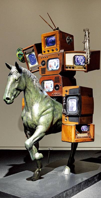 경북 경주 우양미술관에서 열리고 있는 특별전 ‘백남준 : 휴머니티 인 더 서키츠(Humanity in the Circuits)’는 그의 작품과 판화 등 12점을 한 곳에서 만날 수 있는 자리다. 전시장에서 처음으로 관객을 맞는 작품은 백남준이 1991년 우양미술관 개관을 기념해 제작한 ‘고대 기마인상’이다.