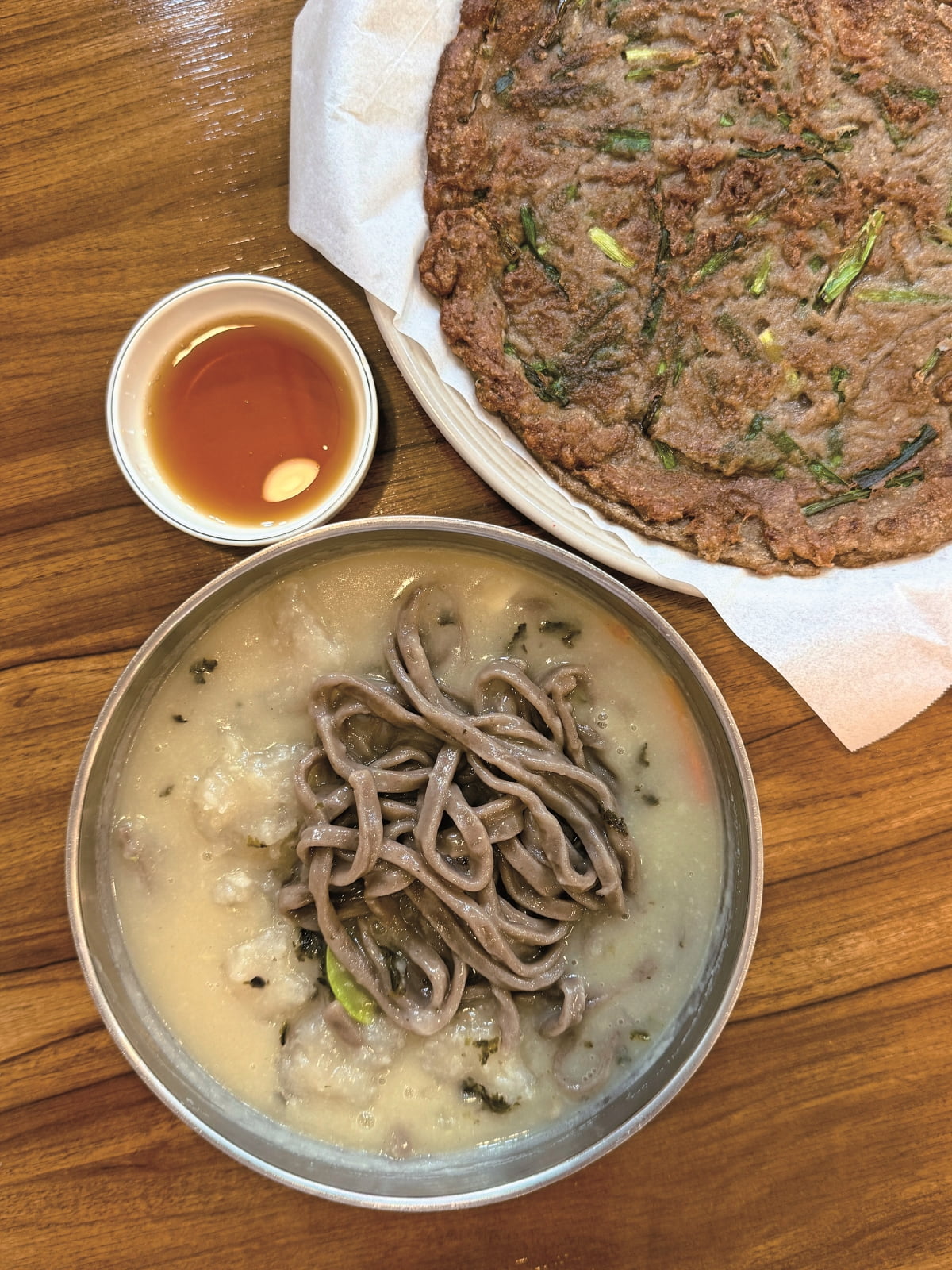 대표 메뉴는 쫄깃한 감자 옹심이와 메밀로 빚어 고소한 칼국수를 함께 즐길 수 있는 감자옹심이메밀칼국수. 옹심이와 메밀면 각각의 식감이 살아 있으면서도 한 그릇에서 완벽하게 균형을 이룬다. 걸쭉하고 진한 국물을 떠먹는 것만으로도 보양이 되는 듯한 든든함을 느낄 수 있다.