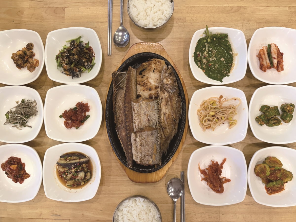 가자미, 고등어, 갈치, 민어조기로 구성된 모듬 생선구이는 겉은 바삭하고 속은 촉촉해 한 점 한 점이 밥과 완벽하게 어울린다. 특히 수도권에서 보기 드문 민어조기는 사장님이 직접 부산에서 공수해 바다의 풍미가 그대로 살아있다.