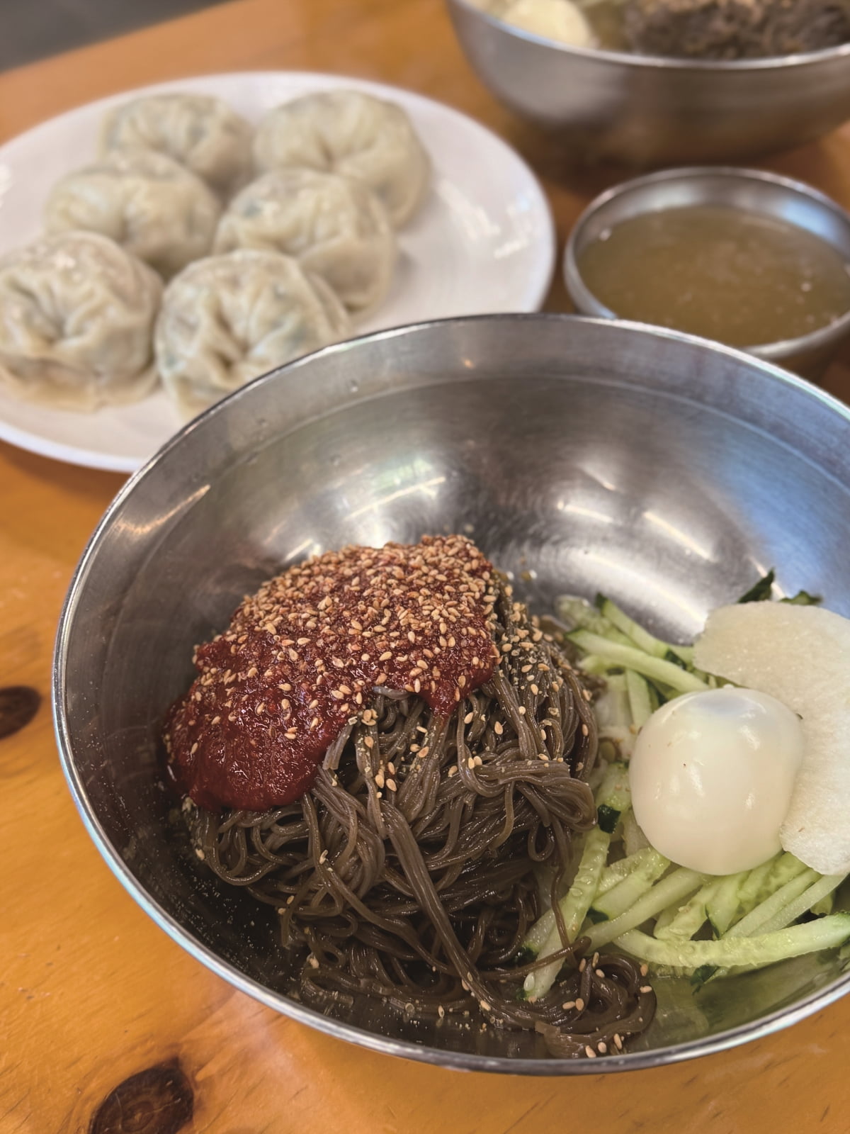 비빔냉면을 주문하면 육수가, 물냉면에는 빨간 다진 양념이 함께 제공돼 하나의 메뉴로 두 가지 맛을 즐길 수 있다. 칡으로 만든 면발은 매우 가늘고 탱글탱글해 부담 없다. 반려견과 함께할 수 있는 전용 공간도 별도로 갖추고 있다.