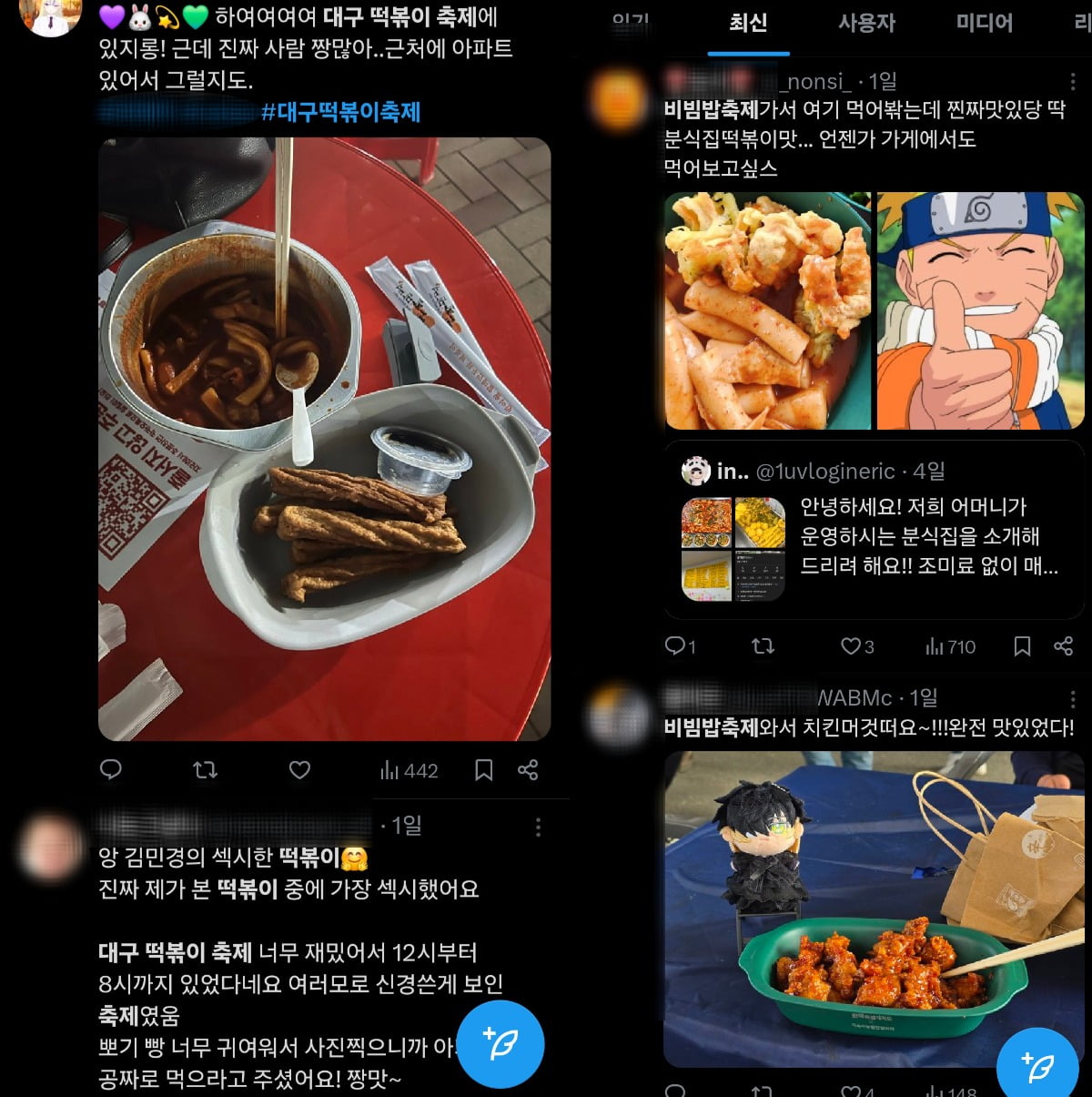 또 다른 이용자는 "엄마랑 대구 떡볶이축제 다녀왔는데 사람 정말 미어터졌다"며 "막창 떡볶이 먹었는데 진짜 너무 맛있었다. 자리가 없어 길바닥에 앉아 먹었다"고 했다.