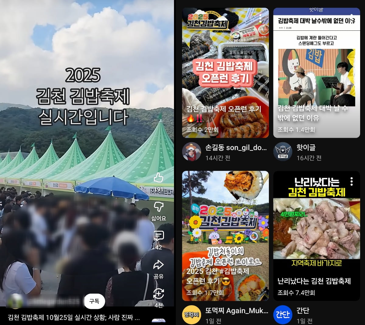 지난해부터 큰 인기를 끈 김천 김밥축제는 올해도 '핫플' 반열에 올랐다. 유튜브에 올라온 '김천 김밥축제' 관련 영상들은 조회수 수십만 회를 기록하며 화제를 모았고, 실시간으로 올라온 김밥축제 후기와 김밥 퀄리티, 인파 현장, 줄지어 선 차량 사진 등이 잇따라 확산하며 열기가 더해졌다.
