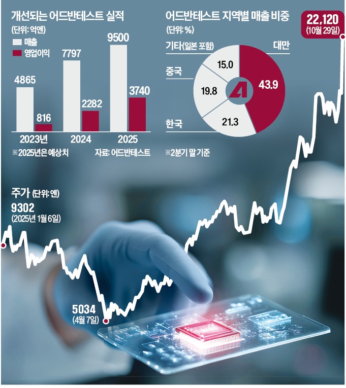 전날 장 마감 후 어드반테스트는 2025회계연도 2분기(7~9월) 실적 발표에서 예상을 뛰어넘는 ‘깜짝 실적(어닝 서프라이즈)’을 신고했다. 매출이 전년 동기 대비 38.0% 늘어난 2629억엔(약 2조4725억원), 영업이익은 70.7% 급증한 1084억엔을 기록했다. 지난해 2분기와 비교해 SK하이닉스 계약 물량으로 추정되는 한국 수출액이 111억엔, TSMC로 예상되는 대만 수출액이 423억엔 급증하며 성장을 주도했다.