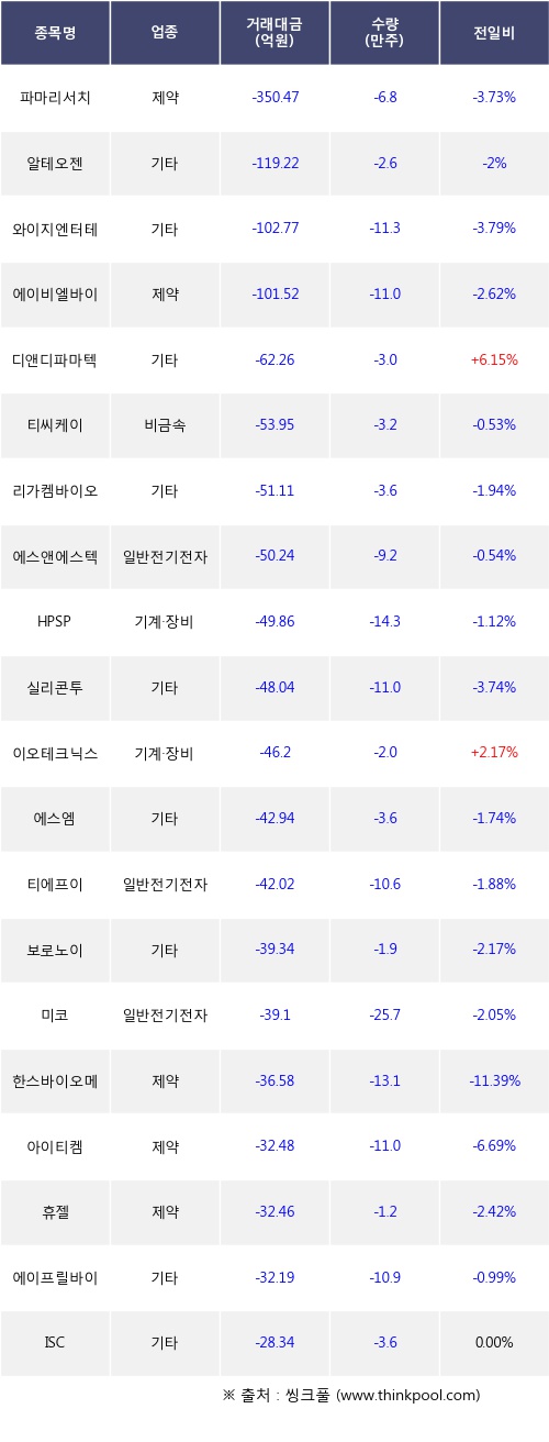 기관 투자자의 순매도 상위 20개 종목은 파마리서치, 알테오젠, 와이지엔터테인먼트, 에이비엘바이오, 디앤디파마텍, 티씨케이, 리가켐바이오, 에스앤에스텍, HPSP, 실리콘투등이다.