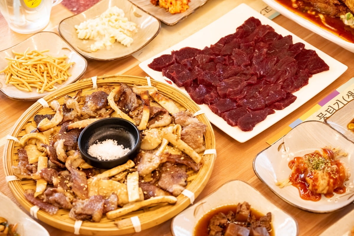 출근길생고기 동대구역점 / 대구의 대표 별미 뭉티기를 제대로 맛볼 수 있는 곳. 신선한 생고기와 육회 스타일의 플레이팅이 인상적이다. 14가지 밑반찬으로 한 상이 가득 차 진짜 ‘대구식 한끼’ 감성이 난다.