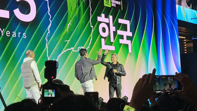 이 회장은 마이크를 잡자마자 "왜 이리 아이폰이 많느냐"며 웃으면서 축사를 시작했다. 이 회장은 "25년 전 엔비디아는 삼성 반도체 DDR D램을 써서 지포스 256이란 제품을 출시했다"며 "그때부터 양사의 협력이 시작됐고 젠슨과 저의 우정도 시작됐다"고 말했다. 황 CEO는 "그때 너는 아이였다"고 농담하기도 했다.