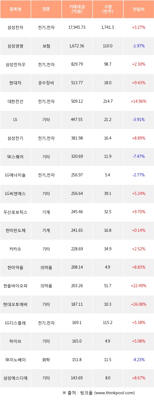 외국인 투자자의 순매수 상위 20개 종목은 삼성전자, 삼성생명, 삼성전자우, 현대차, 대한전선, LS, 삼성전기, SK스퀘어, LG에너지솔루션, LG씨엔에스등이다.