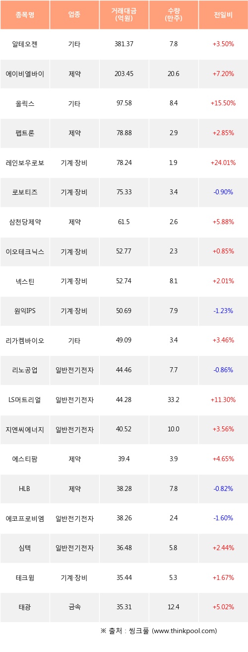 알테오젠, 에이비엘바이오, 올릭스 등은 전일 대비 주가가 상승했고, 로보티즈, 원익IPS, 리노공업 등은 주가가 하락했다.