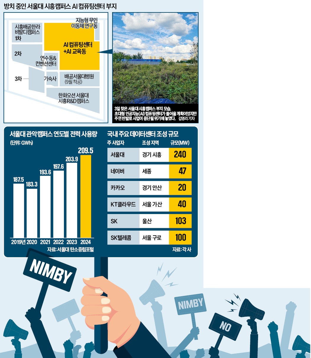 시흥시의회는 올해 인근 장현지구 데이터센터 사업을 ‘초대형 전력 소모와 전자파 피해’ 우려를 이유로 백지화하기로 결의한 바 있다. 이번 사업에 정통한 한 관계자는 “주민 의견 수렴 등 준비를 제대로 못 한 것이 화근”이라며 “부담을 느낀 서울대는 계획안을 전면 중단하고 AI 비전부터 다시 정립하는 단계”라고 말했다.