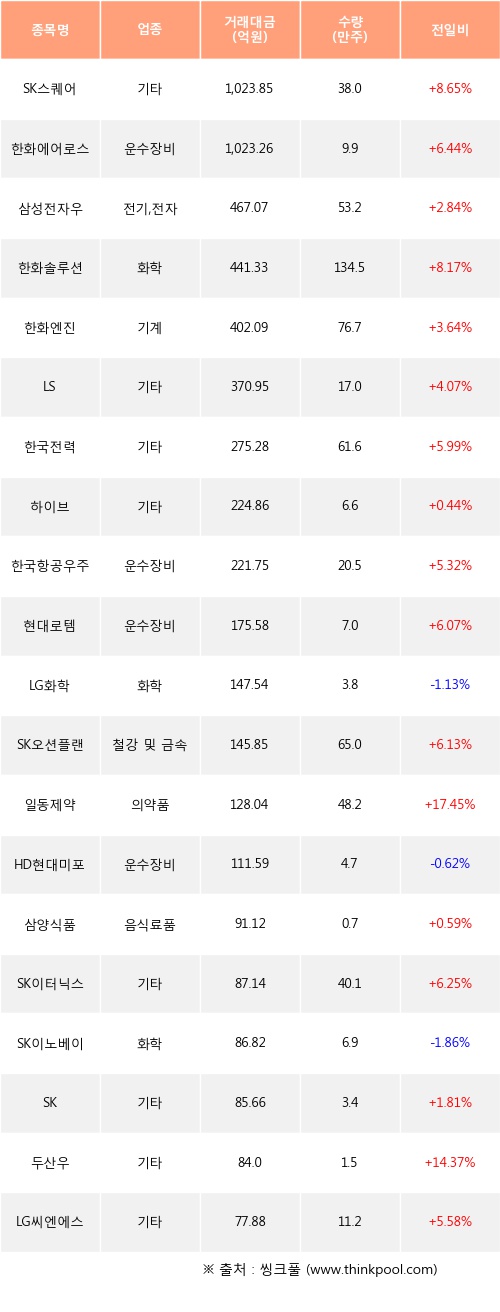 외국인 투자자의 순매수 상위 20개 종목은 SK스퀘어, 한화에어로스페이스, 삼성전자우, 한화솔루션, 한화엔진, LS, 한국전력, 하이브, 한국항공우주, 현대로템등이다.