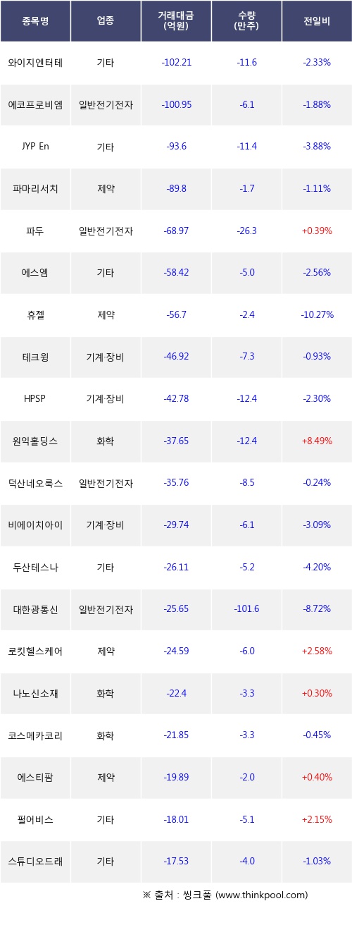 기관 투자자의 순매도 상위 20개 종목은 와이지엔터테인먼트, 에코프로비엠, JYP Ent., 파마리서치, 파두, 에스엠, 휴젤, 테크윙, HPSP, 원익홀딩스등이다.