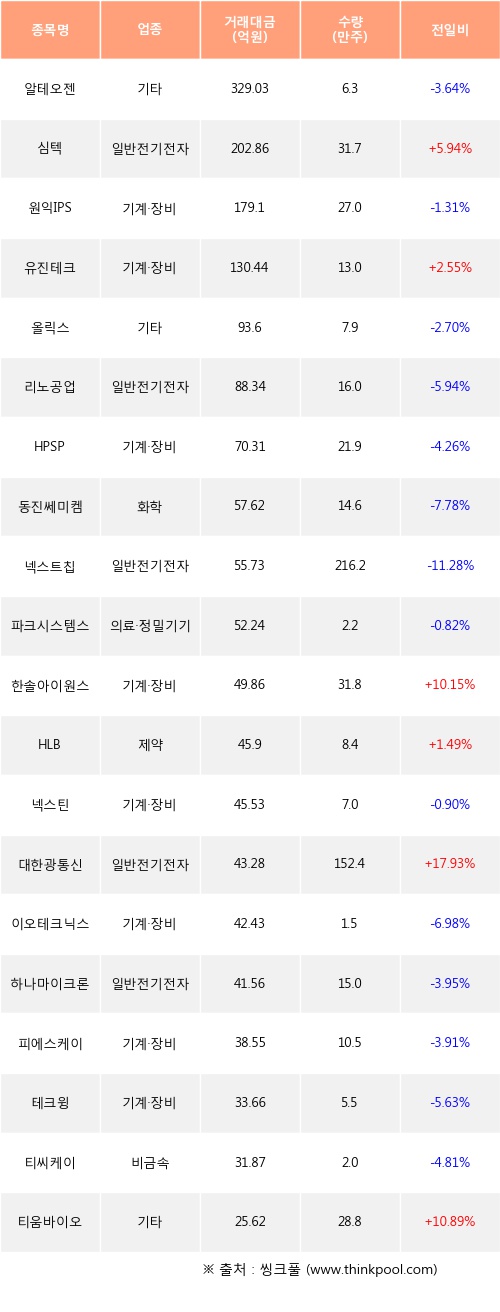 기관 투자자의 순매수 상위 20개 종목은 알테오젠, 심텍, 원익IPS, 유진테크, 올릭스, 리노공업, HPSP, 동진쎄미켐, 넥스트칩, 파크시스템스등이다.