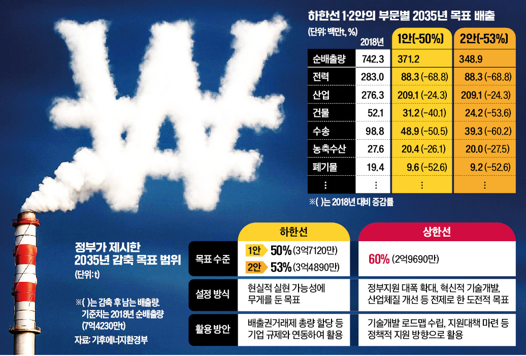 정부가 조만간 유엔에 제출할 2035년 국가온실가스 감축목표(NDC) 최종안은 10년 후까지 2018년 국가 전체 온실가스 순배출량(7억4230만t)의 최소 절반을 줄이겠다는 내용으로 확정될 전망이다. 국무회의 의결 등 절차가 남아 있지만 이대로 결론이 나면 국내 산업 전반의 부담이 불가피하다는 분석이 나온다. 기업들이 온실가스 감축을 위한 설비 투자와 전기요금 급등이라는 ‘이중고’를 부담해야 하기 때문이다.