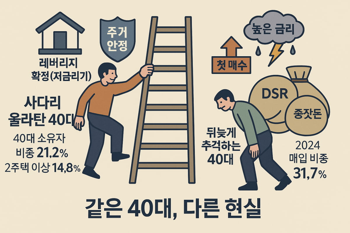 실제로 40대는 상승장 전이나 초·중반에 내 집을 구매하거나 갈아타기로 자산을 확장한 그룹과 가격 급등기·고금리기를 거치며 첫 매수나 갈아타기를 놓친 그룹으로 분명하게 갈린다. 전자는 주거 안정과 자산 증식의 하방이 확보된 층이고, 후자는 월세와 고정 지출의 부담을 떠안게 된 층이다.