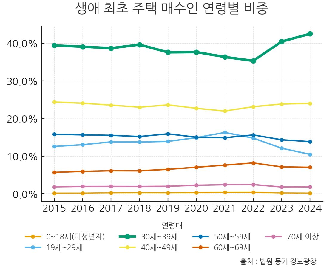 특히 최근 들어 30대 주택 구입자는 부동산 시장의 주축으로 자리 잡았다. 2024년 연령별 아파트 매매 거래 현황을 보면, 30대 비중은 31.7%까지 상승해, 31.9%를 기록한 40대와 어깨를 나란히 했다.