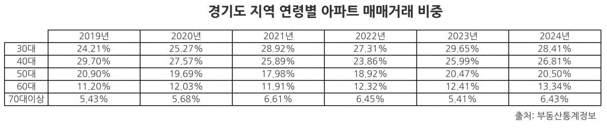 경기도와 인천에서도 30대의 아파트 매입 비중은 꾸준히 높아지고 있다. 경기도의 경우 30대 매입 비중은 2019년 24%에서 2024년 28%까지 올랐고, 인천에서도 같은 기간 24%에서 28%로 증가했다. 집 상승기를 거치며 서울 진입에 실패한 30대가 매입 시점을 늦추기보다는 '지금 살 수 있는 집'에 집중한 결과로 보인다.