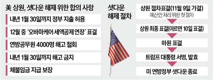 합의안에는 셧다운이 시작된 이후 트럼프 행정부가 단행한 연방공무원 4000명 해고를 철회하고 연방공무원 임금을 보전하는 내용이 담겼다. 민주당이 강력하게 요구해온 오바마케어(전 국민 의료보험) 세액공제를 연장하는 내용은 예산안에 포함되지 않았다. 그 대신 보험료 세액공제 연장 표결을 12월 실시한다는 조항이 들어갔다. 오바마케어 세액공제는 법안이 연장되지 않으면 내년 1월 1일 만료된다.