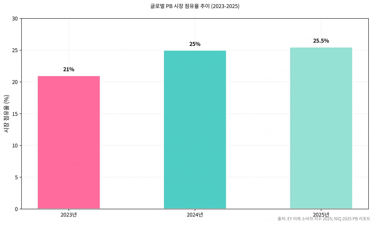 이런 소비자 행동 변화에 힘입어 PB는 '황금기'에 진입했다는 평가다. 세계PB제조사협회(PLMA)에 따르면 지난해 미국 소매 매출 증가분의 47%를 PB가 차지했다. 글로벌 시장에서도 PB 시장은 커졌다. 올해 글로벌 PB 가치 점유율은 24.9%에 달하며, 유럽 시장은 37.6%의 높은 점유율을 기록했다. 페기 데이비스 PLMA의 회장은 "쇼핑객들은 PB가 제공하는 품질, 가치, 혁신의 조합을 분명히 인식하고 있다"고 말했다.
