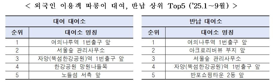 외국인 이용도 빠르게 늘고 있다. 올해 1~9월 외국인 이용 건수는 5만599건으로, 2019년 같은 기간보다 2.5배 증가했다. 외국인 이용이 많은 대여소는 △여의나루역 △서울숲 관리사무소 △뚝섬한강공원 자양역 등 도심 대표 관광지였다.
