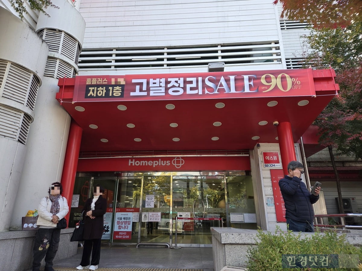 12일 오전 서울 금천구 소재 홈플러스 시흥점. 입구에 “고별 정리 세일”이라고 적힌 커다란 플래카드가 내걸려 있었다. 매장뿐 아니라 인근 지하철역과 주변을 지나는 버스 외벽에도 같은 광고 문구가 나붙었다. 안으로 들어서자 지하 1층 판매 공간의 3분의 1가량이 고별 행사 매대로 꾸며져 있고, “90% 할인”이라고 쓰인 안내문이 곳곳에 붙어 있었다.