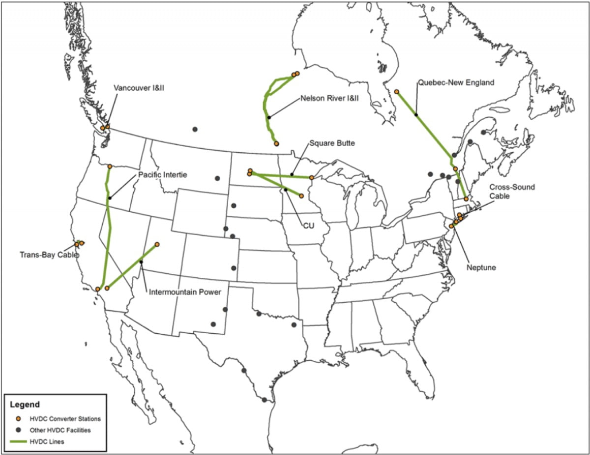 반면 미국은 워싱턴-캘리포니아, 캘리포니아-네바다, 몬타나-노스다코타, 몬타나-사우스다코타, 뉴욕 동부라인을 제외하면 765kV 이상의 HVDC를 찾기 힘들다. 송전선이 지나가는 모든 주에서 허가를 얻어야하는데 이 과정이 복잡하고 지역 반발도 크기 때문이다.