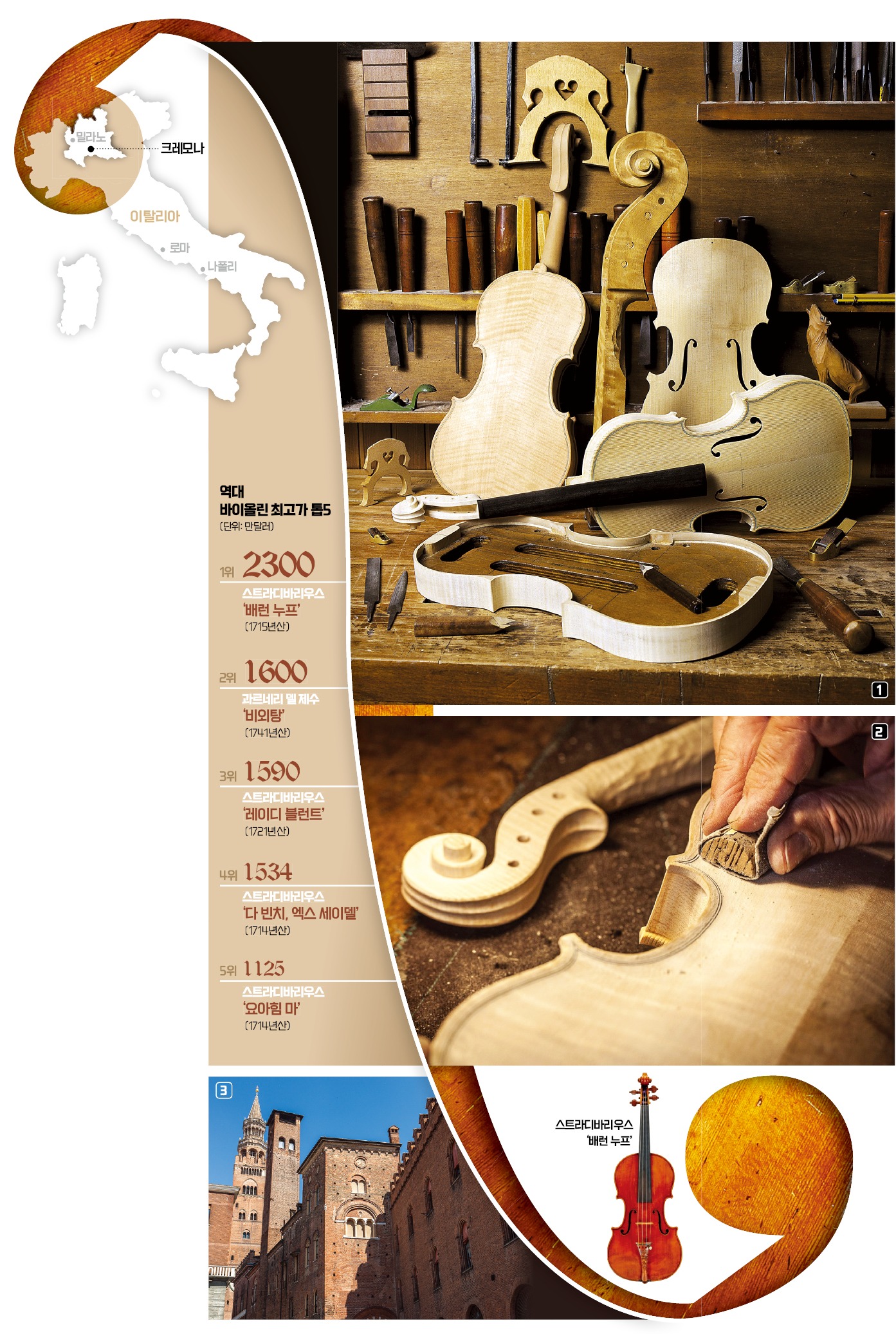 이탈리아 북부 밀라노에서 남동쪽으로 85㎞ 떨어진 크레모나. 이 도시는 500년 역사의 서양 현악기 제작 비밀을 간직하고 있다. 마르칸토니오 인제녜리, 클라우디오 몬테베르디, 아밀카레 폰키엘리, 안토니오 스트라디바리, 아마티 가문과 과르네리 가문 등 위대한 장인들이 크레모나에서 세계 최고의 현악기를 탄생시켰다. 아마티는 크레모나에서 현대 바이올린의 비례와 형태를 정립했고, 이후 스트라디바리와 과르네리가 ‘명품 바이올린’을 완성했다.