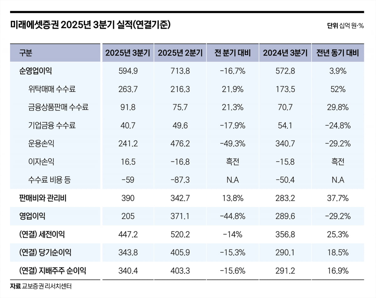 이처럼 역대급 실적에도 불구하고 다양한 투자 자산으로 인해 회계 처리가 복잡하다는 점은 주가의 발목을 잡는 요인으로 작용했다. 미래에셋증권의 3분기 영업이익은 2228억 원으로, 전 분기 대비 55.5%, 전년 동기 대비 39.9% 감소했다. 미국 하와이 호텔 자산 등 일부 해외 부동산에서 1598억 원의 평가 손실이 반영된 결과다.