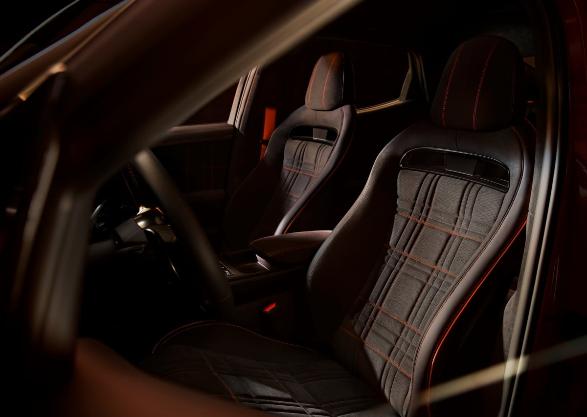 실내는 고급 소재와 스포티한 감각을 동시에 반영했다. 시트, 도어 트림, 센터 콘솔 등 주요 부위에는 스웨이드 계열의 샤무드 소재가 사용됐으며, 내장 컬러에 따라 오렌지 및 그레이 스티치, 퀼팅, 시트벨트를 적용했다.
