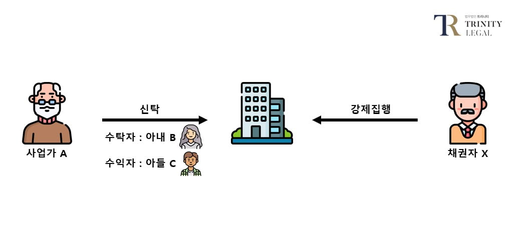 사업가 A씨는 혹시라도 사업이 잘 안돼 추후 가족들이 경제적 어려움을 겪게 될까 고민한 끝에 자산관리 및 승계 전문가인 K변호사와 상담했습니다. K변호사는 가족이 거주하는 아파트만큼은 어떤 상황이 오더라도 꼭 지켜야 하니 그 아파트를 신탁에 넣어두라고 조언했습니다. 그래서 A씨는 아들 C군을 수익자로 지정하고 아내 B씨를 수탁자로 설정해 아파트를 신탁했습니다. 그리고 신탁을 종료, 변경하거나 신탁재산을 처분하기 위해서는 수익자의 동의를 얻어야 한다는 특약을 뒀습니다. 그 후 A씨의 사업이 크게 실패해 많은 채권자에게 시달리는 상황이 됐습니다. 채권자 중 한 명인 X씨는 A씨의 재산을 찾다가 아파트를 신탁한 사실을 알게 됐습니다. 그래서 X씨는 이 아파트를 강제 집행하고자 했습니다. 과연 가능할까요?