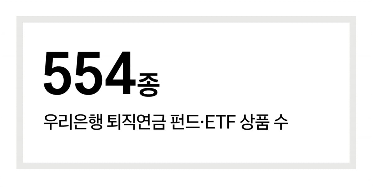 상품 운영 범위도 업권 내 최상위 수준으로 확대됐다. 우리은행 관계자는 “고객의 수익률과 상품 선택권을 높이기 위해 퇴직연금 펀드와 ETF를 대폭 늘렸다”며 “2025년 6월 현재 펀드 384종, ETF 170종 등 총 554종의 상품을 제공하고 있어 은행업권 최다 수준 라인업을 확보하고 있다”고 설명했다. 원리금보장형 상품까지 감안하면 수백 종 규모의 운용 선택지가 마련돼 있어, IRP·DC 고객 입장에선 투자 성향에 따라 세밀한 포트폴리오 구성이 가능하다.