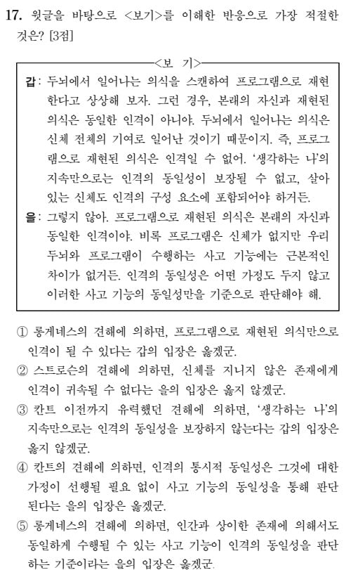 그러나 이 교수는 갑의 입장은 옳기에 3번이 정답이 될 수 없다고 주장했다. 지문을 보면 '칸트 이전까지 인격의 동일성을 설명하는 유력한 견해는 '생각하는 나'인 영혼이 단일한 주관으로서 시간의 흐름 속에 지속한다는 것이었다'는 문장이 도입부에 나온다.