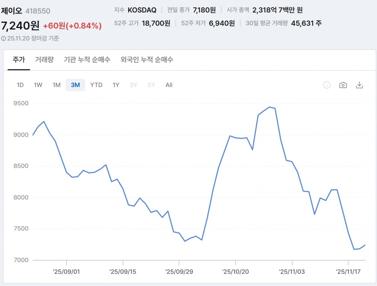 최근 실적은 녹록치 않다. 제이오의 지난해 매출은 828억원으로 상장 첫해인 2023년 1144억원보다 27.6% 떨어졌다. 올해 3분기까지 누적 매출액 역시 458억원으로 지난해 절반을 조금 넘어섰다.