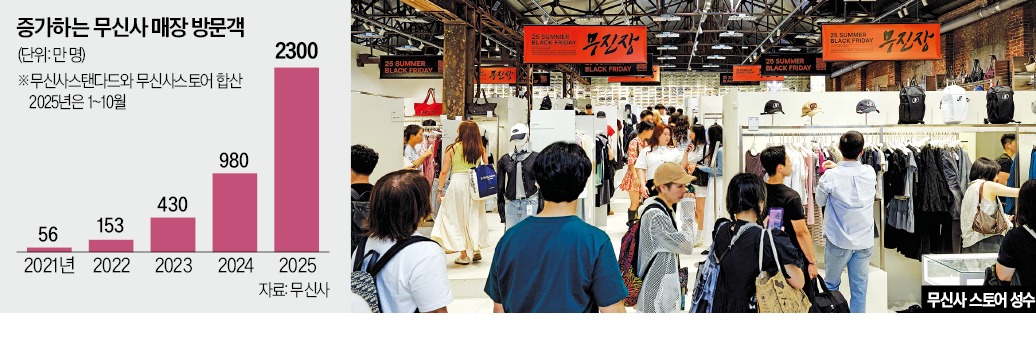 온라인 패션의 강자로 자리 잡은 무신사가 오프라인으로 빠르게 확장하고 있다. 2021년 첫 오프라인 매장을 낸 지 4년 만에 방문객이 2300만 명을 넘어섰다. ‘쇼룸’ 역할의 매장이 방문객을 끌어모으고 앱 사용을 유도하는 온·오프라인 쇼핑몰의 선순환 구조를 구축했다는 분석이다.