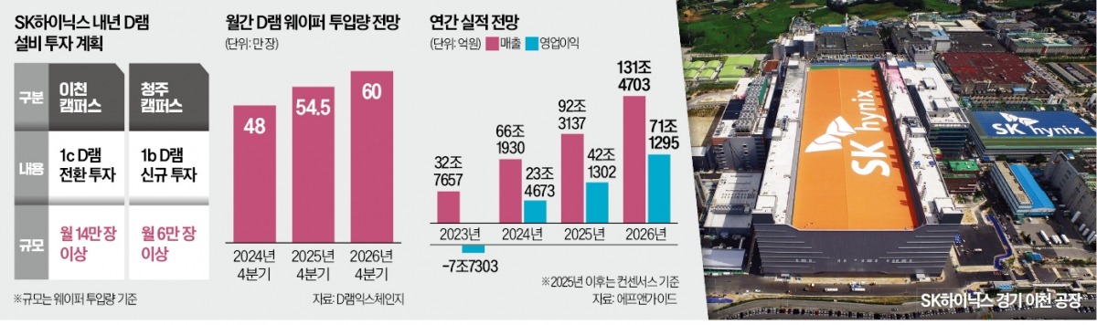 내년 엔비디아에 본격 납품하는 6세대 고대역폭메모리(HBM4)에 들어가는 10㎚ 5세대 D램(1b D램) 증설도 동시에 한다. 올해 말 충북 청주캠퍼스에 문을 여는 신공장 ‘M15X’에 월평균 웨이퍼 6만 장이 투입되는 1b D램 라인을 들인다. 업계에서는 SK하이닉스의 공격적인 D램 투자 속도를 감안할 때 올해 25조원 수준으로 예상되는 시설투자액이 내년에는 30조원을 훌쩍 넘길 것으로 전망하고 있다.