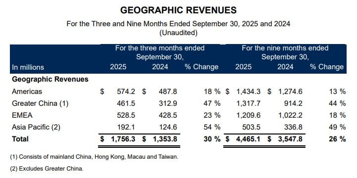 3분기 기준 미국을 포함한 아메리카 지역이 매출이 5억720만달러로 가장 큰 비중을 차지하고 있고 중화권(중국, 대만, 홍콩, 마카오) 매출은 1년 전보다 47% 급증한 4억6150만달러를 기록하는 등 빠르게 성장하고 있다. EMEA(유럽·중동·아프리카)와 아시아태평양 지역 매출도 각각 전년대비 23%, 54% 늘었다.