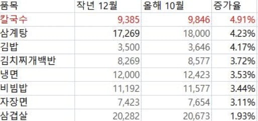 나머지 6개 메뉴별 가격 상승률은 김밥(3500원→3646원) 4.17%, 김치찌개 백반(8269원→8577원) 3.72%, 냉면(1만2000원→1만2423원) 3.53%, 비빔밥(1만1192원→1만1577원) 3.44%, 자장면(7423원→7654원) 3.11% 순이다.