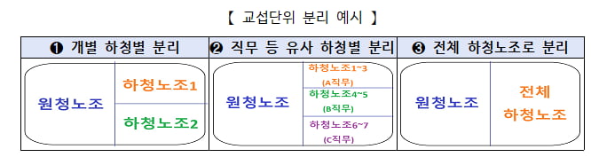 입법 예고된 시행령에 따르면 고용노동부는 일단 현행 교섭창구 단일화 제도의 틀은 유지한다. 하지만 하청노조가 원청노조와 창구 단일화를 원하지 않을 경우 교섭 창구를 '분리'해 원청과 직접 교섭할 수 있게 허용한다. 한발 더 나아가 아예 '원칙적으로' 원청노조와 하청노조 간 교섭단위를 분리한다는 입장이다. 만약 하청노조가 교섭단위 분리 신청을 하지 않는다면 원청노조와 하청노조가 연대해 교섭하도록 정부가 지도할 계획이다. 사실상 하청 노동조합에게 교섭을 분리할지를 두고 '선택권'을 준 셈이다.