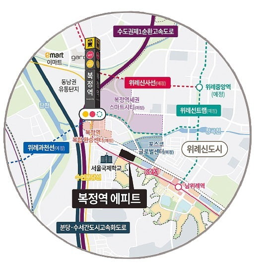 복정역 에피트의 장점은 또 있다. '강남 옆세권'이라는 점이다. 서울 지하철 8호선과 수인분당선 환승역인 복정역과 8호선 남위례역이 가깝기 때문에 강남권 출근이 쉽다. 수도권제1순환고속도로와 동부간선도로도 있어 이동이 편리하다.