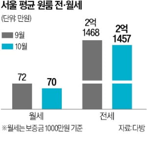 25일 부동산 정보 플랫폼 다방이 국토교통부 실거래가 공개시스템을 분석한 결과, 지난달 거래된 서울 연립·다세대 원룸(전용면적 33㎡ 이하)의 평균 월세는 70만원(보증금 1000만원 기준), 평균 전세 보증금은 2억1457만원으로 집계됐다. 지난 9월보다 월세는 2만원(3%), 보증금은 11만원(0.1%) 하락했다.서울 25개 구 가운데 10곳의 월세가 평균을 웃돌았다. 월세가 가장 높은 곳은 강남구로 95만원으로 나타났다. 서울 평균의 135% 수준이다. 강남구는 지난 6월 이후 5개월 연속 월세 1위를 기록했다. 이어 서초구 86만원, 영등포구 81만원, 금천구 77만원, 용산구 76만원, 중랑구 75만원, 광진구 73만원 순이었다.