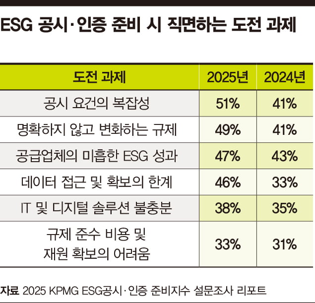 기업들이 ESG 공시 및 인증 과정에서 직면한 주요 도전 과제로는 ‘공시 요건의 복잡성’(전년 대비 +10%p)과 ‘불명확하고 변화하는 규제’(전년 대비 +8%p)가 가장 큰 비중을 차지했으며, 이 밖에 ‘공급업체의 미흡한 ESG 성과’, ‘데이터 접근성 한계’, ‘IT 및 디지털 솔루션 부족’, ‘규제 준수 비용 부담’ 등이 뒤를 이었다.